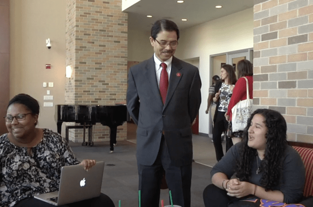 St. John’s University alumna Liz Faublas ’91SVC, host of NET-TV’s “Currents,” came to St. John’s to tour the Queens campus with President Conrado “Bobby” Gempesaw, Ph.D. on Tuesday, May 2. Together, they visited the new state-of-the-art home of the Peter J. Tobin College of Business, St. Thomas More Church, and the D ‘Angelo Center, where the two sat down for an in-depth discussion about Dr. Gempesaw’s first three years as President of St. John’s.