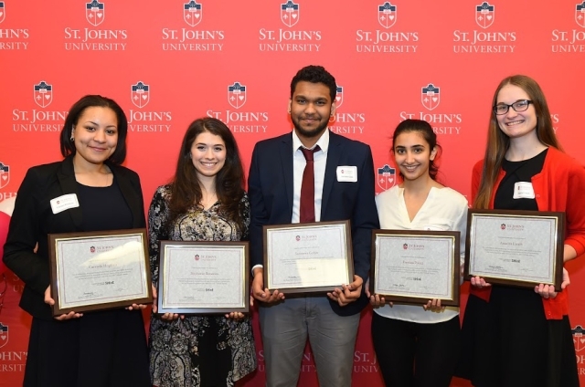Held the week prior to National Student Employment Week, the awards luncheon was an opportunity to celebrate the contributions of student workers, thank supervisors for playing an active role in their students’ career development, recognize semifinalists, and present the five top-performing students with their SHinE awards. Mary V. Cascio, Student Employment Manager, welcomed guests and Rev. Bernard M. Tracey, C.M., Executive Vice President for Mission, gave the blessing. Other guests in attendance included Jeffrey W. Fagen, Ph.D., Dean of St. John’s College of Liberal Arts and Sciences; Norean R. Sharpe, Ph.D., Dean of The Peter J. Tobin College of Business, Joseph H. and Maria C. Schwartz Distinguished Chair, and Professor of Decision Sciences; Katia Passerini, Ph.D., Dean of the College of Professional Studies; Sharon Hewitt Watkins, C.P.A., Vice President for Business Affairs, Chief Financial Officer, and Treasurer; Jorge L. Rodriquez, Vice Provost and Chief Enrollment Officer; Jeanne M. Umland ’79C, ’82G, ’93PD, Associate Vice President, Advancement and University Relations; and Kathryn T. Hutchinson, Ph.D., Vice President, Division of Student Affairs.