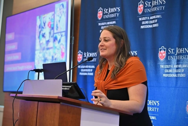 Meghan M. Dunn, Ph.D., Assistant Professor, Division of Mass Communication, who researches how information and knowledge are conducted through emerging technologies, presented new and established AS-L partnerships for the University. Current St. John’s partners include the Chapin Home for the Aging in Jamaica, NY, and the Central Family Life Center on Staten Island.“The industrialization of education took students outside of communal learning and put them into an individualized environment,” Dr. Monteiro explained. “This is why Academic Service- Learning is important. It can help us socialize and rebuild a community of learners.”