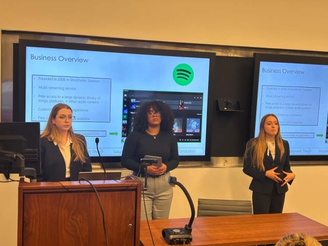 Brianna joined classmates Karina Bono and Katrina Heckman in recommending buys in two large telecommunications stocks—Spotify and Verizon—who they believe are primed for expansion. Katrina, a Management major, said the exercise gave her a better sense of how to properly value companies, which could pay dividends later.