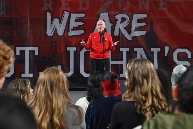 “The basketball team just had a spectacular season! But the most important thing about St. John’s is not basketball and it’s not new buildings–it is the people here at St. John’s. We have incredible faculty and staff dedicated to a singular mission–our students,” said Rev. Brian J. Shanley, O.P., University President, during remarks he delivered at the Accepted Student Day pep rally inside Carnesecca Arena.