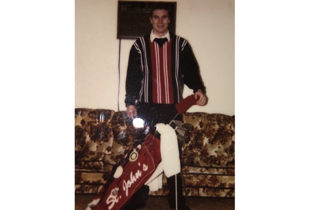 Alumni Michael O'Shea '97C member of the 1995 Golf Team showing off his St. John's logo golf bag.