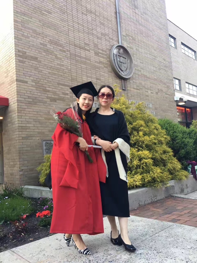 Eileen Fornaro, daughter of alumni William B. Fornaro '71CBA, '78MBA and Ellen B. Fornaro '78MBA standing in front of Spirit Rock in 2019 during one of their many visits to our Queens campus.