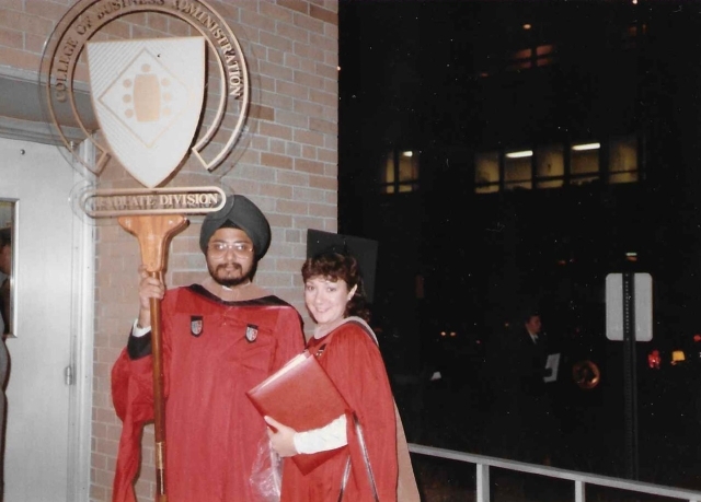 Paul Ravinder Singh '85MBA and Laura Bellacicco '83CBA, '85MBA standing with their school banner at their graduate level commencement ceremony in 1985.