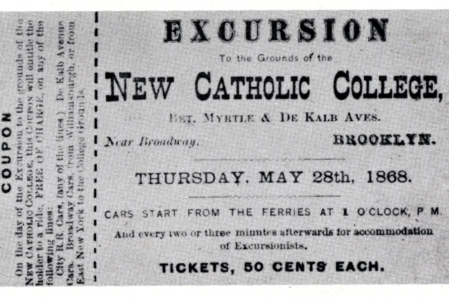 The groundbreaking for the new Catholic college, then to be called, "Mary, Queen of the Isles," took place on May 28, 1868. An article published the following day in the Brooklyn Daily Eagle described in great detail the interest and anticipation of approximately 5,000 spectators that attended, as well as the content of the speeches given by Governor Lowe of Maryland, and Father Ryan.
