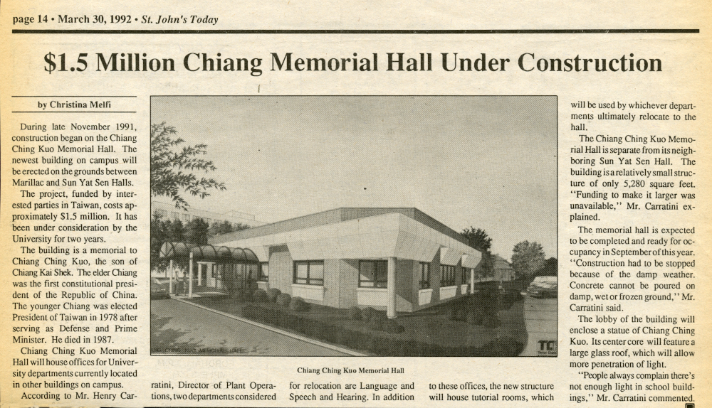 The groundbreaking ceremonies for a new Asian Studies Center took place on October 8, 1971. The Torch announced in an article on February 11, 1972 that although the building was originally going to be constructed on Union Turnpike between Alumni Hall and the Tennis Courts, the building was relocated to the rear of St. Augustine Hall. The Dedication Ceremony for the new building, named after the founder of the Republic of China (Taiwan), Dr. Sun Yat-Sen, was held on September 8, 1973.