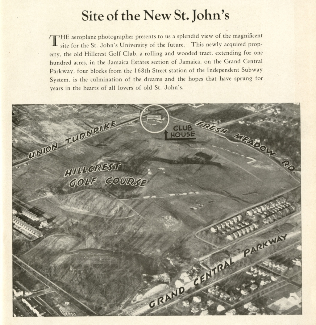 The April 30, 1936 issue of "The Torch" student newspaper announced that the Very Rev. Edward J. Walsh, C.M., president, had signed a contract to purchase the Hillcrest Golf Club two months prior, on February 11. It would become the site of the future Queens campus of St. John's University. Over the next two decades, plans to start building the new campus were delayed several times, especially due to World War II. It was announced in 1946 that Henry V. Murphy would be the architect for the campus. Finally, at a luncheon at the Hillcrest Golf Club on June 18, 1953, the Very Rev. John A. Flynn, C.M., president, announced the plan to begin construction of the Queens campus on February 11, 1954.