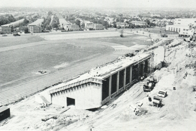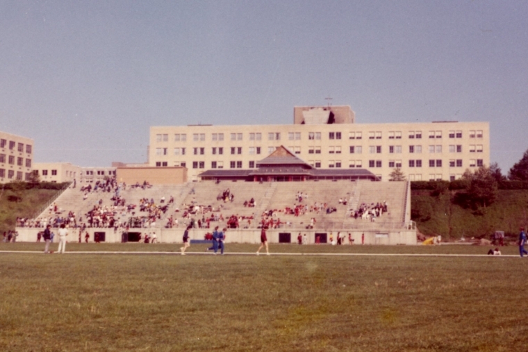 St. John’s Stadium was completed in 1964 at the same time St. Augustine Hall, Marillac Hall, and Perboyre (now Newman) Hall were constructed. It consisted of a large concrete grandstand in front of the running track.