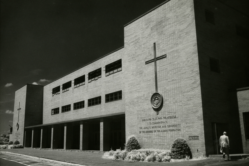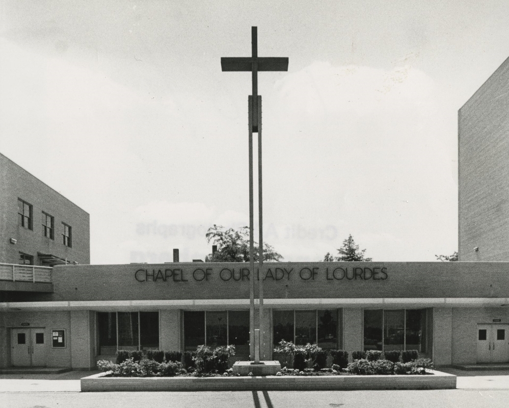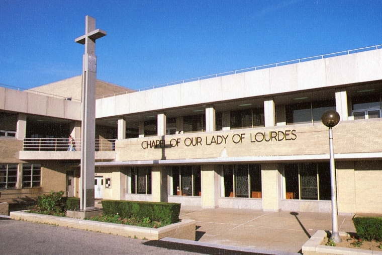 The Chapel of Our Lady of Lourdes was completed in 1964 at the same time St. Augustine Hall, Marillac Hall, and Perboyre (now Newman) Hall were constructed. It was located in the L-shaped part of Marillac, next to the library building. It had more space than the temporary chapel inside of St. John Hall, seating up to 520 people, but still was not the freestanding church originally envisioned in the 1950s Master Plan.