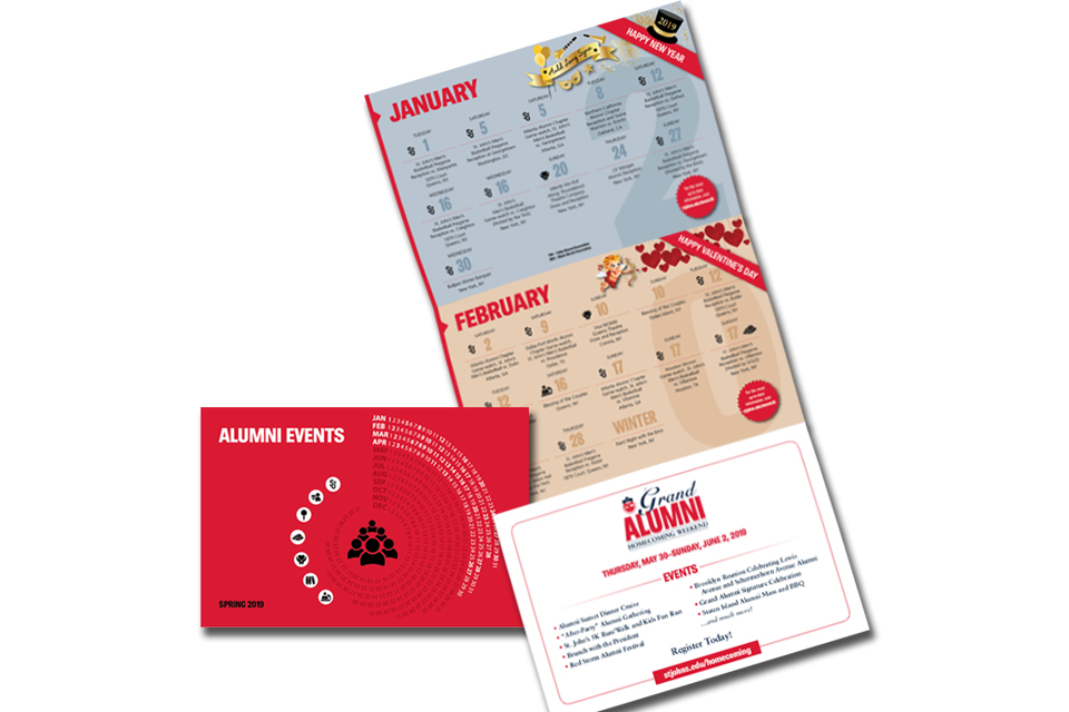 | 2019 | Honorable Mention | Print Media Branding/Calendar | Alumni Events Calendar - Spring 2019 |
