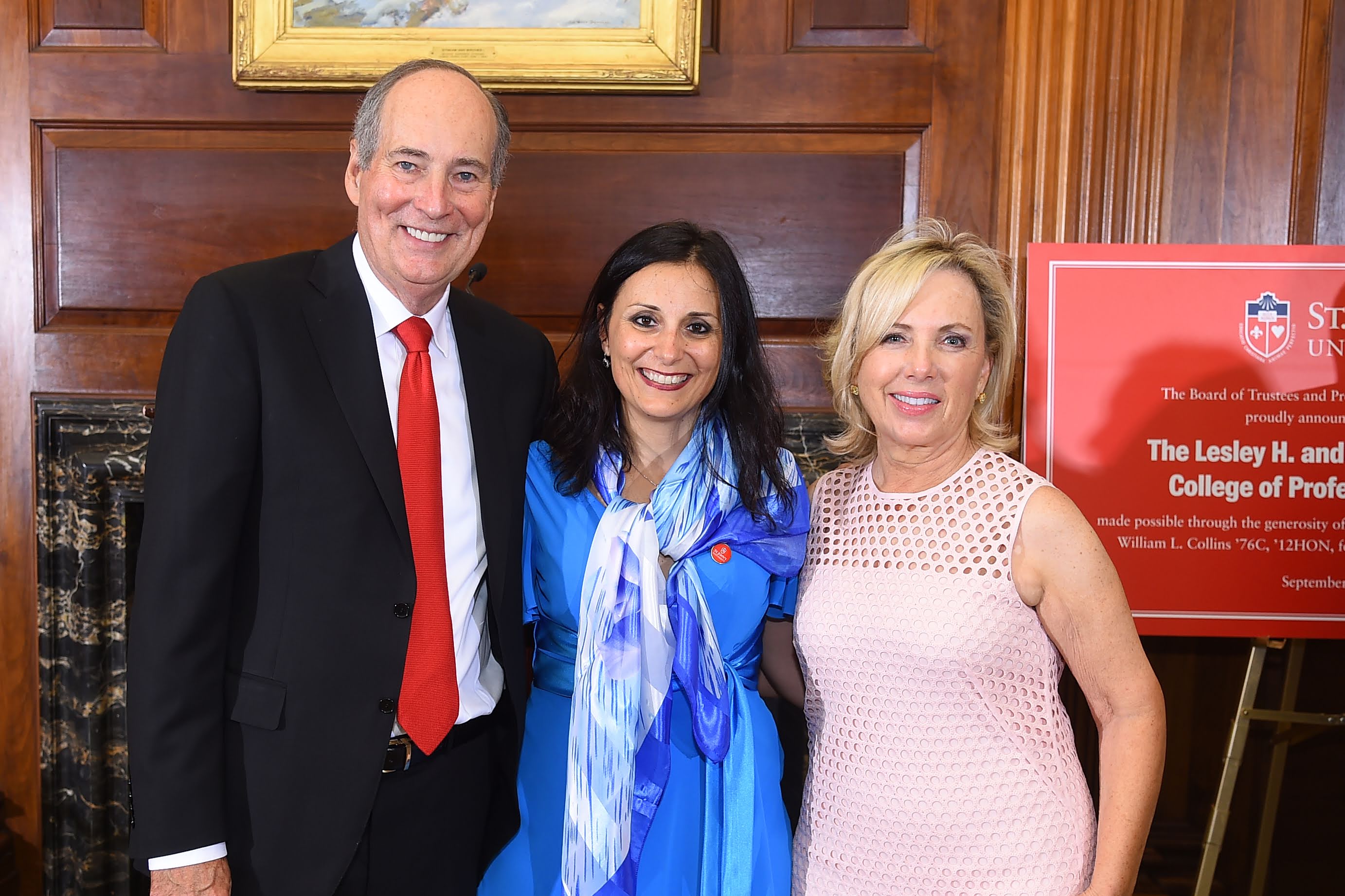 History was made with the exciting news of a new era at St. John’s University. At a reception in midtown Manhattan on September 11, Dr. Gempesaw announced that with the unanimous approval of the Board of Trustees, the College of Professional Studies is renamed The Lesley H. and William L. Collins College of Professional Studies, effective immediately.
