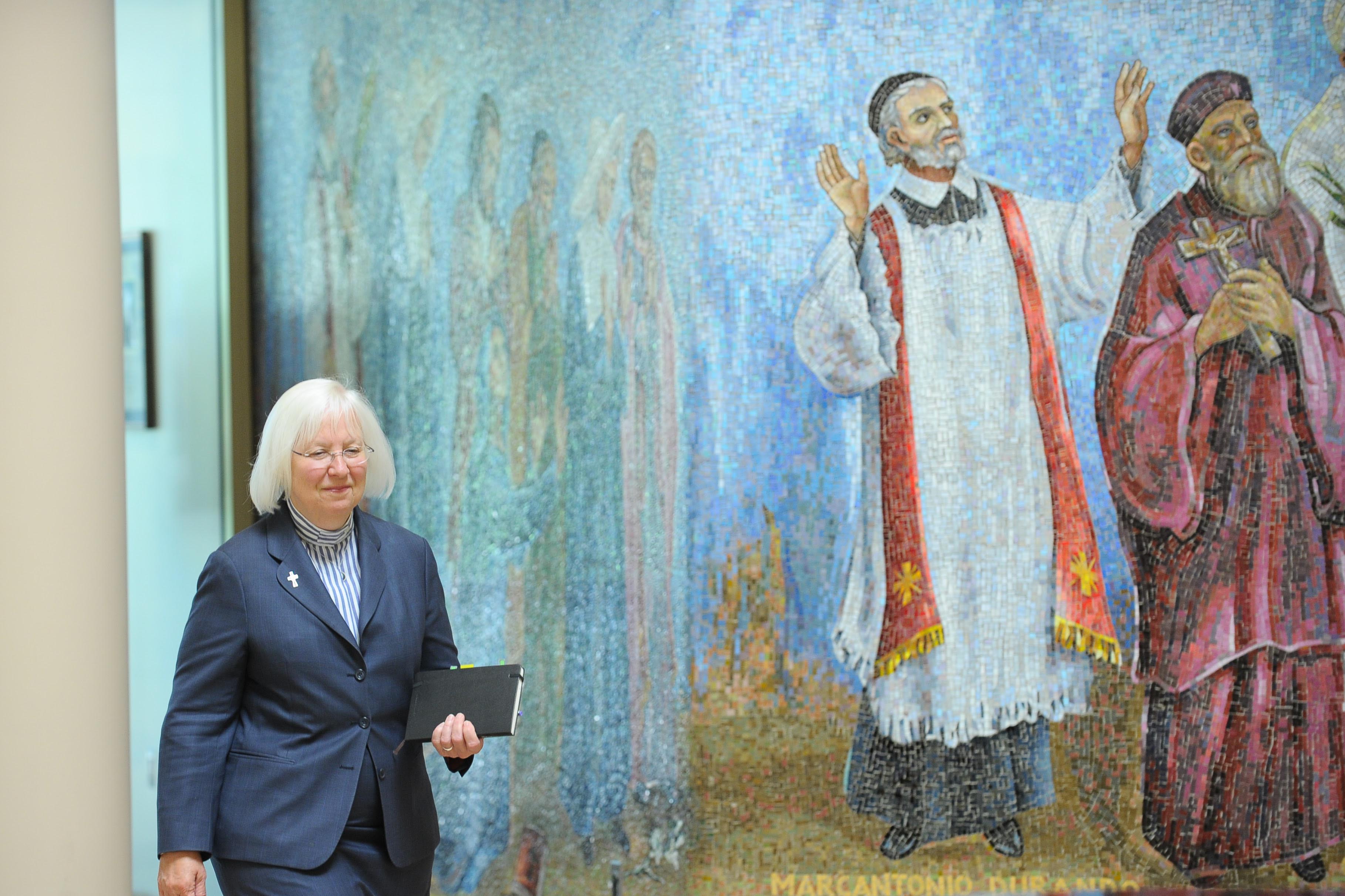“The architectural plans drawn up for this campus in 1954 include a church on this very site,” said Julia A. Upton, R.S.M., Ph.D., Provost Emerita and Distinguished Professor of Theology, St. John’s College of Liberal Arts and Sciences, at the first opening school Mass inside St. Thomas More Church. “For half a century, members of the University community held fast to this dream and never relinquished it.” For much of that period, they worshipped and gathered in the Chapel of our Lady of Lourdes, a small space located in Lourdes Hall.