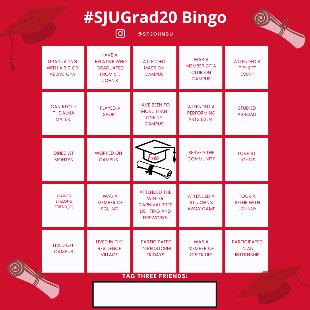 Download your own #SJUGrad20 bingo card. Post it to your Instagram story and tag @StJohnsU. We want to see!