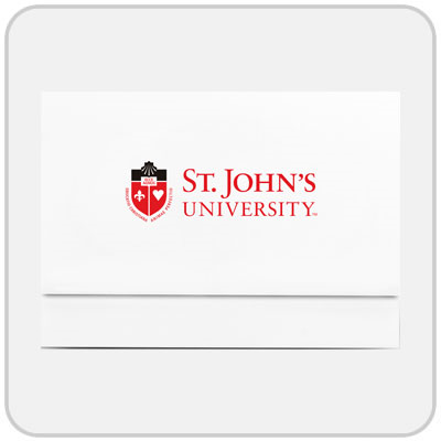 The diploma case is a custom red leatherette case inscribed with “St. John’s University” and the University seal in gold. The case is horizontal and includes a protective clear cover to prevent damage to your diploma.