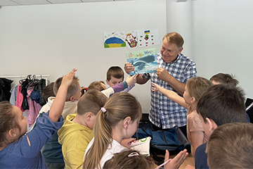 Michael Sampson reading to Ukrainian refugee children in Warsaw, May