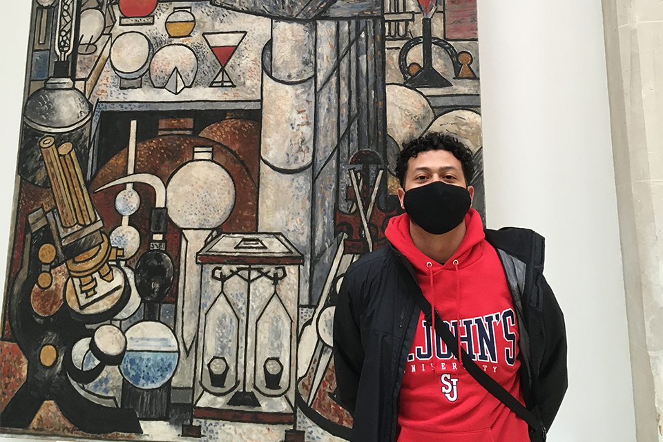 WES Pharmacy student Manuel Martis poses in front of a mural by Marcel Gromaire entitled “The Chemist,” commissioned in 1938 for the University of Paris College of Pharmacy. Photo taken by Farida Khatchadourian, Feb. 2022.