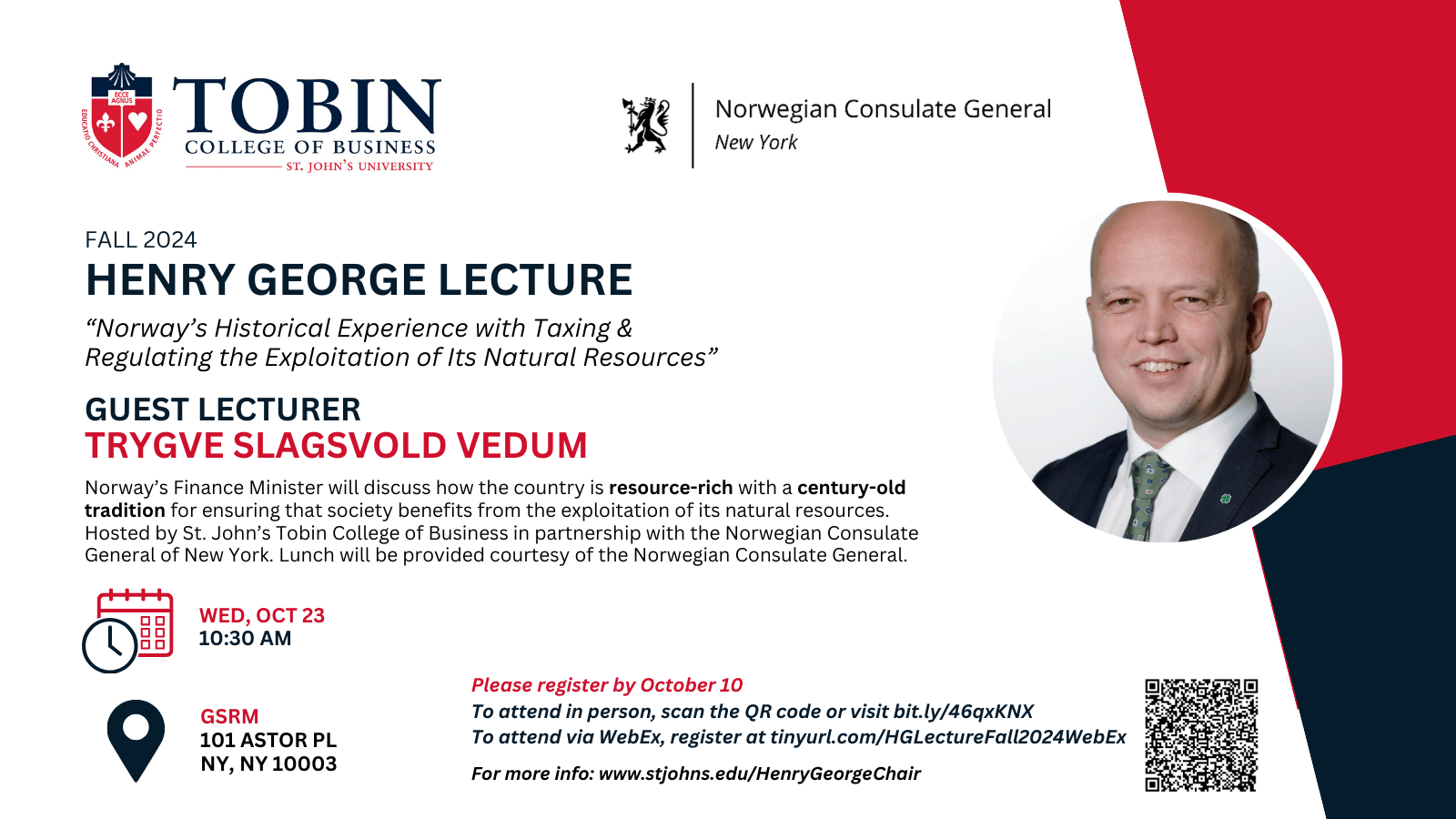 Norway’s Finance Minister, Trygve Slagsvold Vedum, was the keynote speaker at St. John’s University’s semiannual Henry George Lecture Series hosted by The Peter J. Tobin College of Business in partnership with the Norwegian Consulate General of New York.