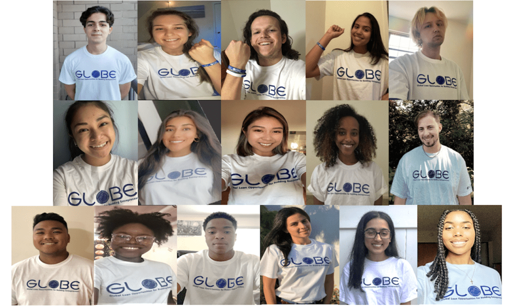 Each semester, students enrolled in the Global Microloan Program will update this site with their weekly program logs. The Fall 2020 student teams include Enterprise Development and Program Impact Audits; Finance and Risk Assessment; Marketing and Fundraising; and Technology and Communications. ln order for this semester's class to be featured (without wearing masks) during the pandemic, we have made a collage of their selfies sporting their GLOBE tees!