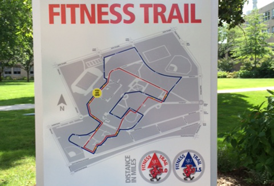 The campus also features two fitness trails for walkers and runners—the red trail, which is one mile in length, and the blue trail, which is 1.5 miles.