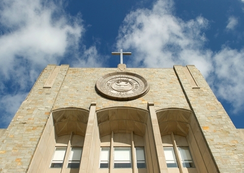 The University seal over the main entrance to St. Augustine Hall is 16 feet in diameter.