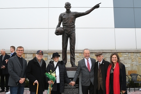 The newest statue on campus is a depiction of Coach Carnesecca. It is located in the lobby of the building that bears his name.
