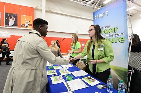Jason Huang ’17TCB was one of 837 students who gathered to meet potential employers in Taffner Field House for this year’s Spring Career Fair held on February 16.