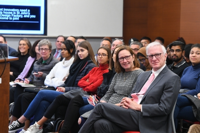 “Our student innovators need a house. This house is St. John’s Design Factory, and you are all welcome to join,” said Luca Iandoli, Ph.D., Associate Dean for Global Programs and Research, before a crowd of well-wishers that included students, faculty, administrators, staff, and invited guests who gathered on Monday, October 28, in the CCPS lobby just outside the Design Factory.