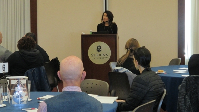 Regina Calcaterra, best-selling author of memoir Etched in Sand, A True Story of Five Siblings Who Survived an Unspeakable Childhood on Long Island delivered the keynote address at a November 2nd Trauma Conference hosted by The School of Education and its Alumni Leadership Advisory Council. In attendance at Trauma Informed Teaching: Critical Approaches to Working with Students in the K-12 Classroom were approximately 65 teachers, guidance counselors, principals, and district administrators. They included current St. John's students, alumni, and guests with no prior connection to The School of Education.