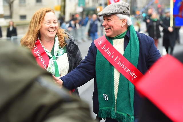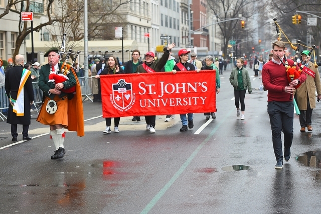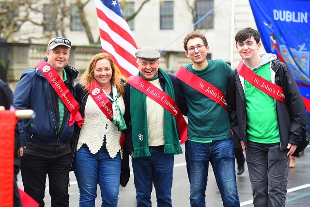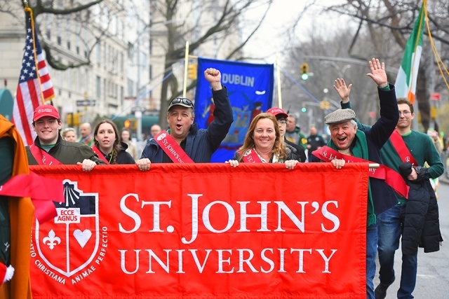 After gathering for the noon daily Mass, the St. John’s crowd had a special alumni brunch at Stout NYC Restaurant and Bar, where they enjoyed Irish food, music, and good cheer. As brunch concluded, a small group headed over to Fifth Avenue, where they proudly represented the University during the brisk march from West 47th Street north to 79th Street. Enjoying cheers from the spectators along the parade route, many Irish eyes were smiling, and the spirit of St. John’s was apparent to all.