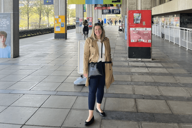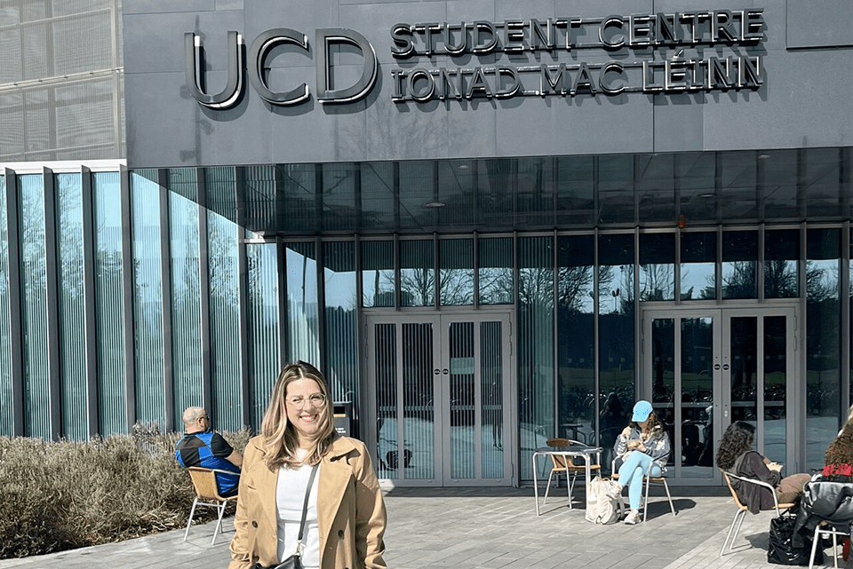 Katherine Aquino standing in front of the Writing Center at University College Dublin.
