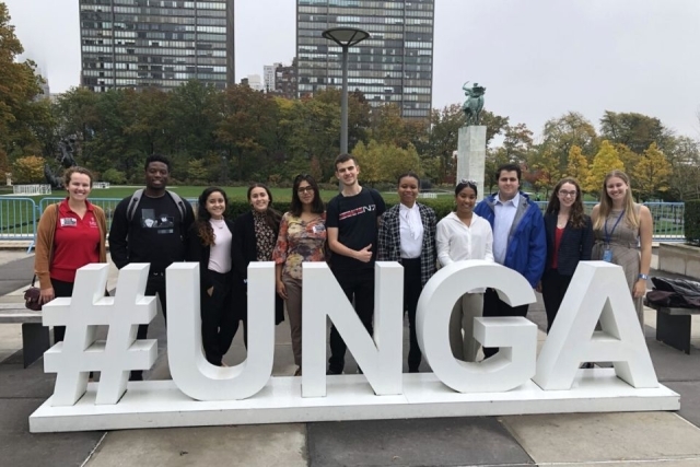 Nine students accompanied Victoria O’Keefe, Residence Campus Minister for Social Justice, on the trip to Manhattan’s East Side, home of the UN since the building’s completion in 1951. The organization was established in 1948, three years after the end of World War II. The St. John’s group toured the facility exactly 60 years after the Cuban Missile Crisis played out on the floor of the General Assembly, a signature moment in 20th-century geopolitics.