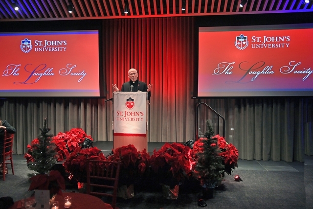 Rev. Brian J. Shanley, O.P., President of St. John’s, addressed donors by recounting that upon his arrival he was struck by the 150th anniversary banners on campus that read “Faithful to the Mission.” “St. John’s University has always been faithful to its founding mission to be a place for immigrants and their children to obtain a quality, Catholic education,” he said. “I love the tagline of our current brand campaign, Education That Elevates, as it summarizes all that we do at St. John’s. We elevate students’ minds through the power of learning and elevate their opportunities to get to a position where you all are now—and that is to be able to give back and help the next generation of St. John’s graduates.”