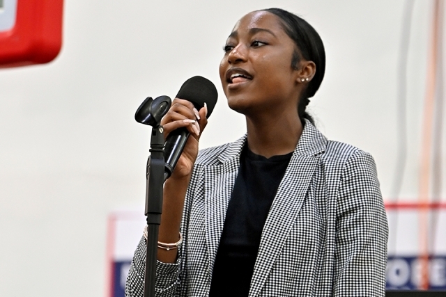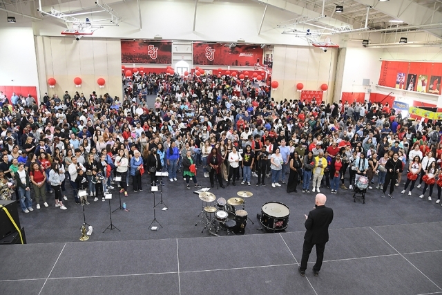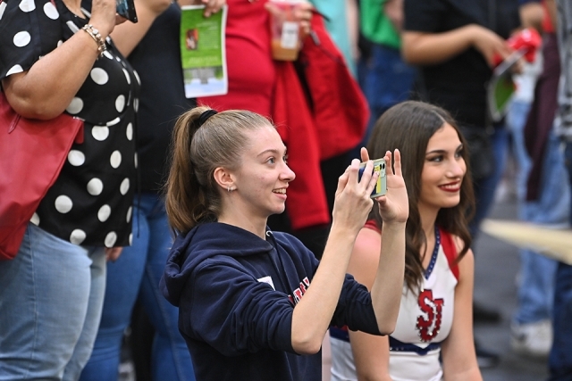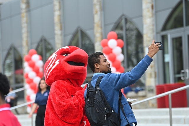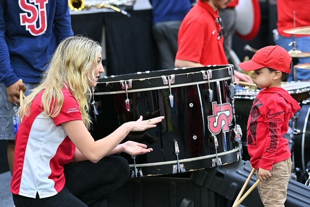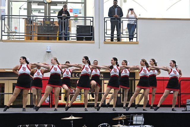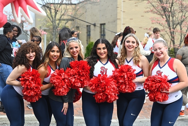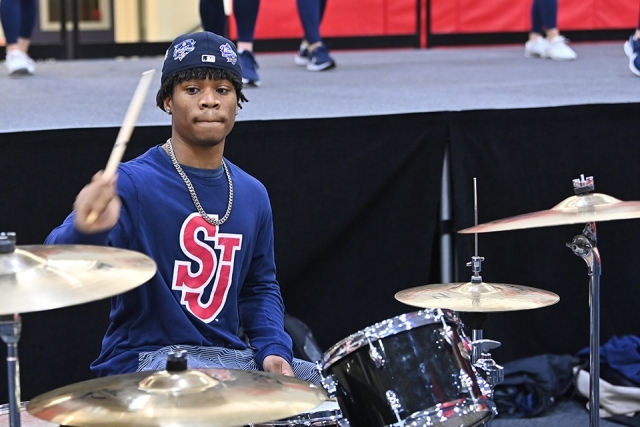 Before Fr. Shanley’s remarks, the pep rally kicked off with performances by the St. John’s Pep Band, Dance Team, Kickline Team, and Cheerleading Team. University mascot Johnny Thunderbird was a notable presence at the event, mingling with students and posing for selfies with them and other guests. Alpha Psi Omega, a dramatic honor fraternity, also participated in the pep rally.