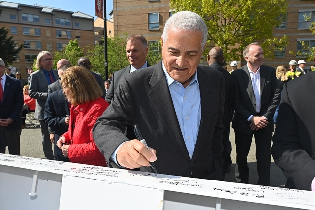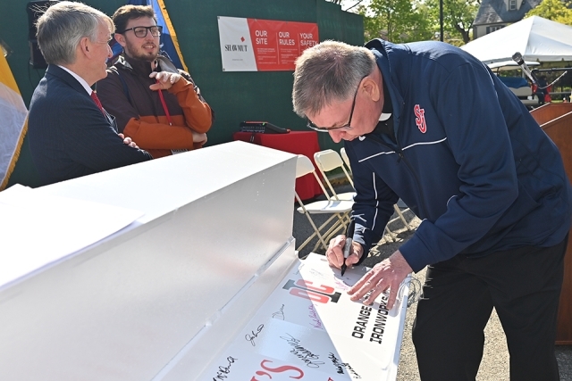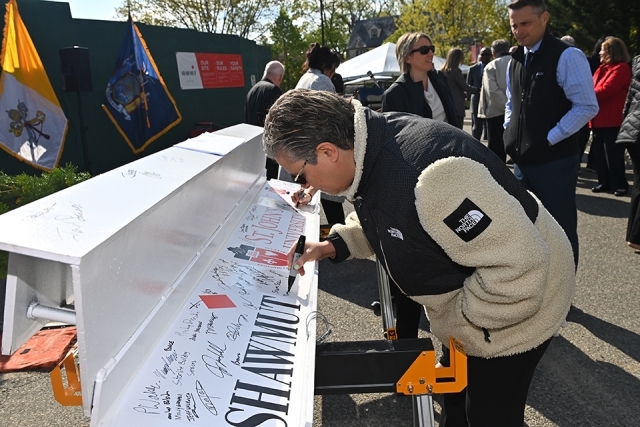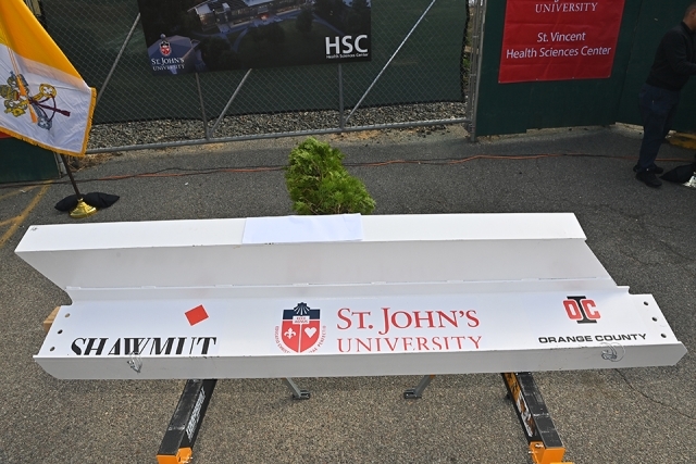 After the beam was blessed with holy water by Rev. Aidan R. Rooney, C.M., M.Div., M.Th. ’78NDC, Executive Vice President for Mission, select guests were invited to individually sign the beam. The variety of names immortalized on the radiant white beam include Fr. Shanley; the D’Angelos; Honorable Donovan Richards Jr., Borough President of Queens; senior campus leaders; members of the Real Estate Advisory Committee; the Nursing Initiative Executive Team; and the College of Pharmacy and Health Sciences’ Advisory Board.