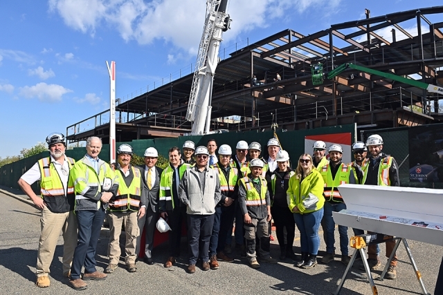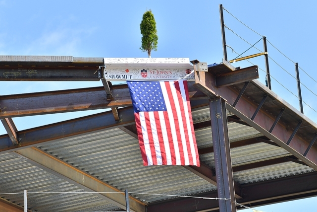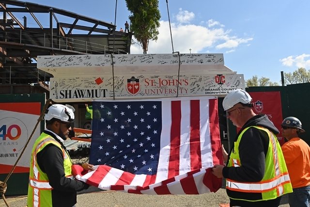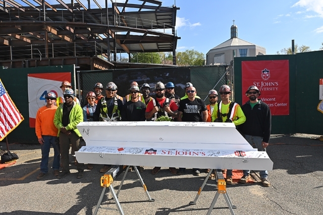 On a bright, sun-splashed morning at St. John’s University’s Queens, NY, campus, the final piece of steel in the construction of the innovative St. Vincent Health Sciences Center was hoisted three stories above a cheering crowd. Gathered to witness the milestone event on April 25 were an eclectic mix of clergy, Trustees, dignitaries, University administrators, faculty, members of the design and construction teams from Shawmut Design and Construction and CannonDesign, and organized labor partners—all united in the mission of advancing health-care education.