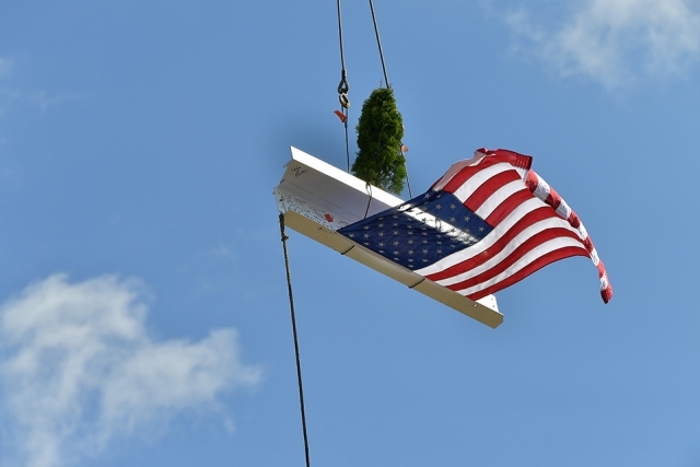 Reminiscent of old-fashioned barn-raising celebrations, in the United States the beam in a topping-off ceremony is typically adorned with a small evergreen tree and an American flag. This custom celebrates the construction process and is viewed as the first introduction of the building to the public.
