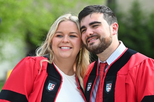 This past Sunday, standing outside Carnesecca Arena in graduation gowns, the couple posed for one last photo as St. John’s Law students before donning gold tasseled tams and joining classmates, families, faculty, and alumni to celebrate Commencement 2023.
