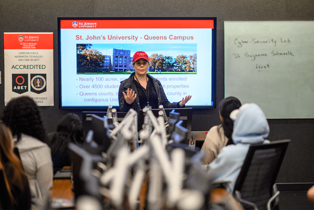 Hackathons are social coding events that bring together programmers, computer science students, and others interested in technology to improve upon or create new software programs. They have become increasingly popular as interest in tech careers has soared. The St. John’s event awarded prizes for the best artificial intelligence code, the best cybersecurity enhancement, and more. Judges came from among industry professionals, members of St. John’s faculty and administration, as well as students in the University’s Cyber and Information Security, Cyber Security Systems, Computer Science, and Homeland Security programs.