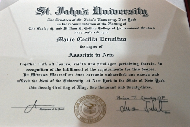 More than six decades after she first enrolled, longtime Valley Stream, NY, resident Marie Cecilia Ervolino received her diploma earned from St. John’s University.
