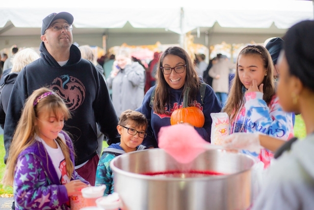 The Homecoming Fest, held on the final day of Homecoming Weekend, was a powerful draw for alumni and family members as they gathered outside of Taffner Field House on the tennis court lawn to enjoy a barbecue that included hot dogs and hamburgers, fall-themed desserts, and beverages with wine provided by John Musto '13MBA and beer from Flagship Brewery co-founded by James J. Sykes '05CCPS. Attractions to suit all ages were provided, including inflatables, face painters, balloon artists, a DJ, illusionist Chris Dare '14TCB, and a photo booth. Johnny Thunderbird roamed the tennis courts, and a “Trunk or Treat” activity was held by the Motor Enthusiast Organization with a nod to Halloween.