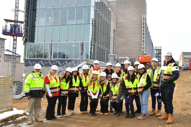 The tour was given on February 15 by the University’s Department of Design and Construction and Shawmut Design and Construction. The 70,000-square-foot building will be the permanent home of the nursing program and house existing and forthcoming health sciences programs in one facility. It will provide state-of-the-art technology, simulation labs, and flexible room layouts to allow for many teaching and learning styles, and ensure that future health-care workers can keep pace with the dramatic advancements in the industry.