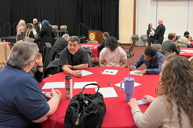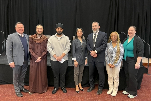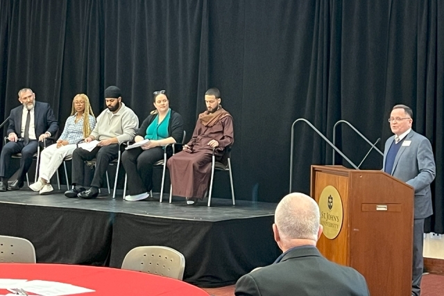 Moderator Teresa Delgado, Ph.D., Dean, St. John’s College of Liberal Arts and Sciences, and Professor, Department of Theology and Religious Studies, introduced the question, which panelists attempted to answer through Jewish, Roman Catholic, Muslim, Sikh, and evangelical Christian lenses. The discussion was the foundation of the seventh annual Interfaith Dialogue and Dinner at the D’Angelo Center Ballroom, sponsored by the University’s Interfaith Ministry and Division of Student Success.