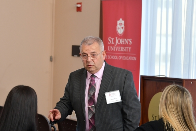 More than 60 student teachers attended. Joining them were Alumni Advisory Board members, faculty, administrators, and staff from The School of Education. James D. Wolfinger, Ph.D., Dean, The School of Education, welcomed the school representatives, who met with blocks of St. John’s students in 15-minute intervals.