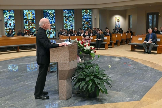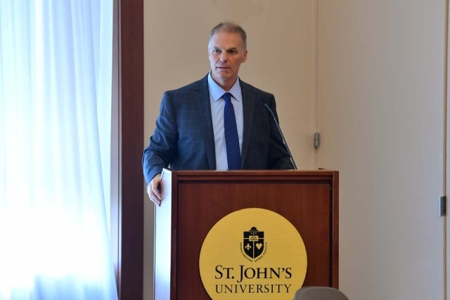 Joseph E. Oliva, Esq. ’91CBA. ’94L, Senior Vice President and Chief Operating Officer, spoke to administrators and staff about concrete ways St. John’s addresses this year’s Founder’s Week theme. “You have to be aware of what it is that needs to be done,” Mr. Oliva stressed. “We need to be aware that there’s a need. The suffering of others can become invisible to us, especially the poor and marginalized.”