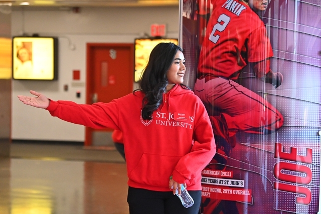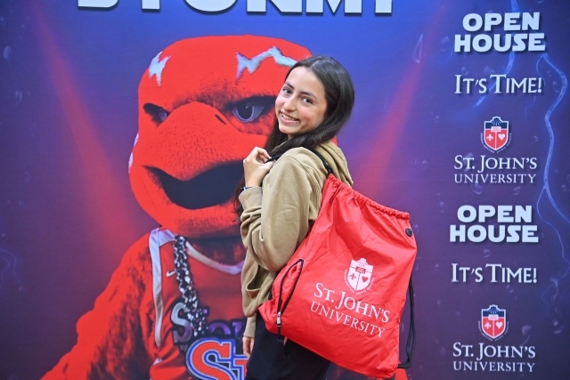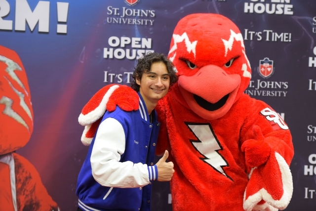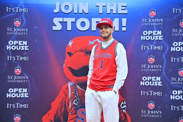 In a scene reminiscent of a star-studded movie premiere, high schoolers, their friends, and families were welcomed to step onto a red carpet unfurled along the floor of Taffner Field House on the Queens, NY, campus. There, they received boxes of popcorn before posing for photos with St. John’s mascot, Johnny Thunderbird while standing beneath a banner that carried the event’s theme, “It’s Time to Discover St. John’s.”