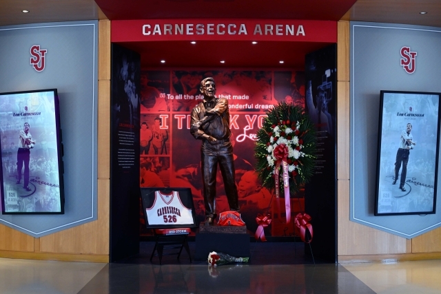 In October 2021, St. John’s University dedicated and blessed the Lou Carnesecca statue in the lobby of Carnesecca Arena.