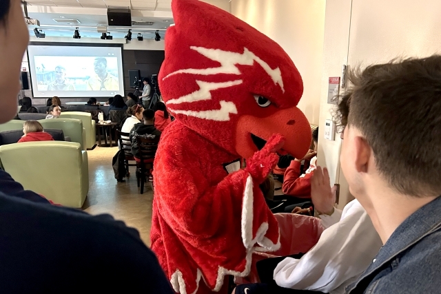 More than 150 students gathered to enjoy pizza and cheer on the Red Storm, 31–4 and seeded second in the West Region, believing the best way to celebrate the team’s historic season and first NCAA Tournament game since 2019 was to do it together.