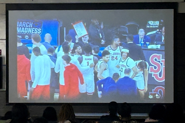 Red Storm spirit percolated throughout the Sodano Coffee House in the D’Angelo Center on March 20 as St. John’s University students joined to watch the Red Storm defeat Omaha, 83–53, in the opening round of the National Collegiate Athletic Association (NCAA) Tournament.