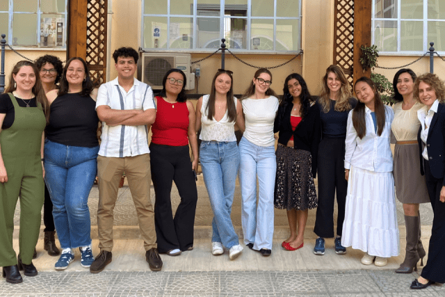 Valeria Asquini, teacher; Elisa Bracalente, Assistant Director, Rome location; Simona Ciavolella, Coordinator of Academics and Program Development, Rome location; Samuel Rivera, SOE student; Daneiela Bermudez, SOE student; Gwyneth Boccio, SOE student; Amelia Wojtkowski, SOE student; Kaitlyn F. Messina, SOE student; Caterina Visocchi, teacher; Sophie Liu, SOE student; Cristina D’Amico, teacher; and Mary Ann Maslak, Ph.D., Professor, Department of Curriculum and Instruction, The School of Education).