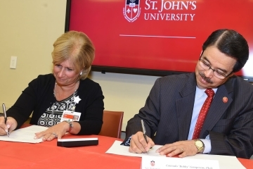At a signing ceremony held at St. John’s University’s Queens campus, the University, and NewYork-Presbyterian Queens entered into an agreement to explore new opportunities to collaborate in health care services, community wellness, academic programs, research efforts, and educational endeavors between the two long-serving metropolitan institutions. The two institutions have already collaborated on areas of sports medicine and public health awareness, and are expanding the partnership to better serve the Queens community.
